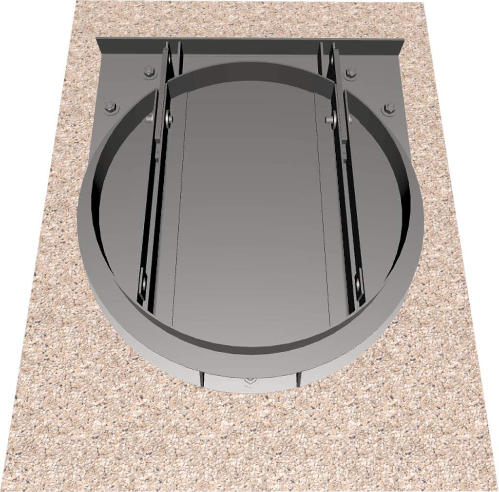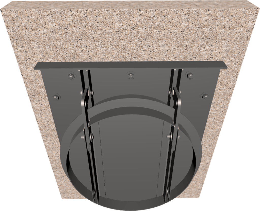 Gate frames may be embedded in the channel walls. mounted to a wall with anchor bolts, mounted to a pipe flange, or wall thimble. Wall thimble mounting is possible although it is usually only necessary for applications with high unseating heads. Gates can also be designed to mount to existing wall thimbles or existing pipe flanges. Flanged frames or flat frames are available for gates to cover square, rectangular or round openings in concrete structures.