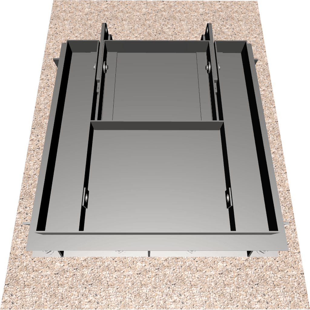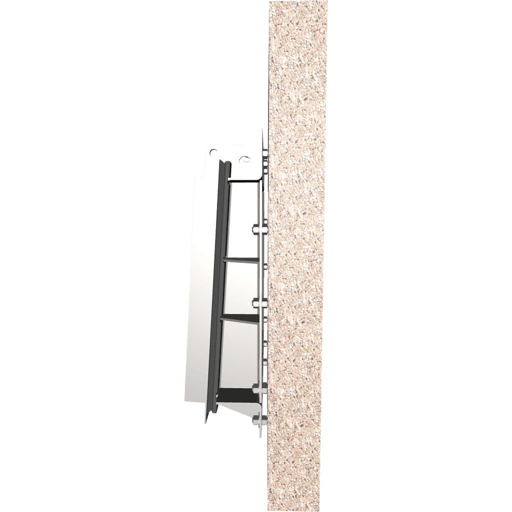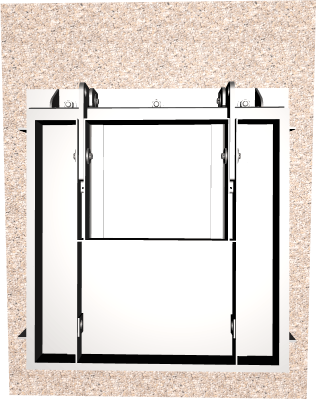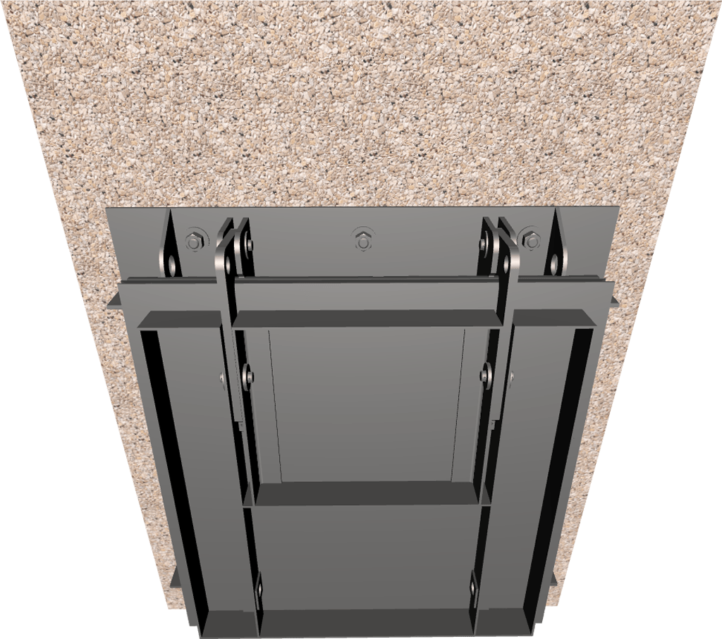 Gate frames may be embedded in the channel walls. mounted to a wall with anchor bolts, mounted to a pipe flange, or wall thimble. Wall thimble mounting is possible although it is usually only necessary for applications with high unseating heads. Gates can also be designed to mount to existing wall thimbles or existing pipe flanges. Flanged frames or flat frames are available for gates to cover square, rectangular or round openings in concrete structures.