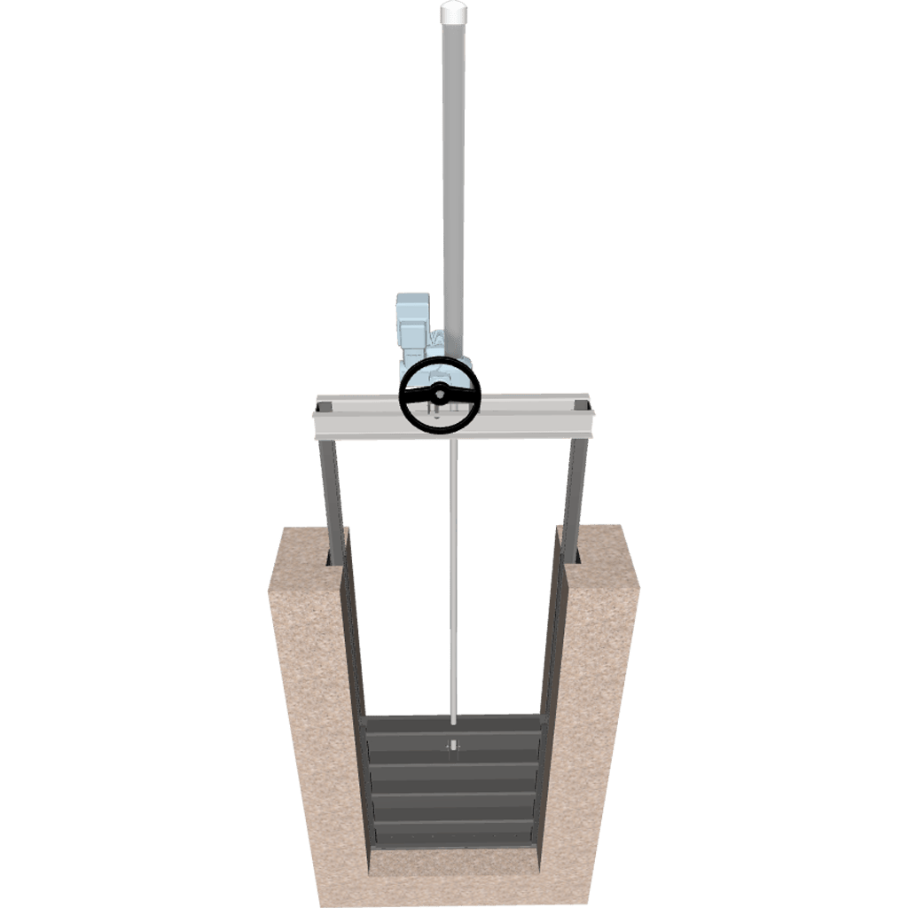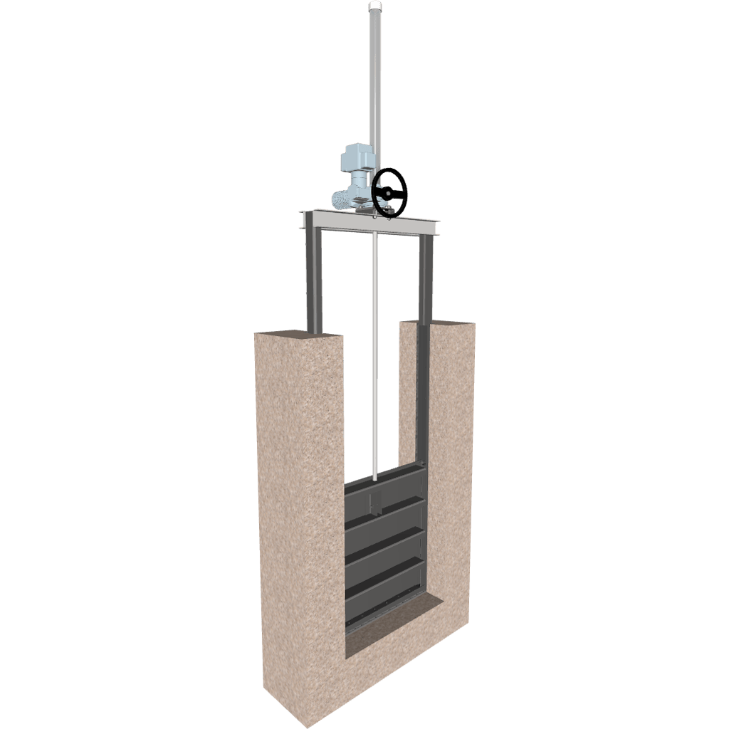 Gate frames may be embedded in the channel walls. mounted to a wall with anchor bolts, mounted to a pipe flange, or wall thimble. Wall thimble mounting is possible although it is usually only necessary for applications with high unseating heads. Gates can also be designed to mount to existing wall thimbles or existing pipe flanges. Flanged frames or flat frames are available for gates to cover square, rectangular or round openings in concrete structures.